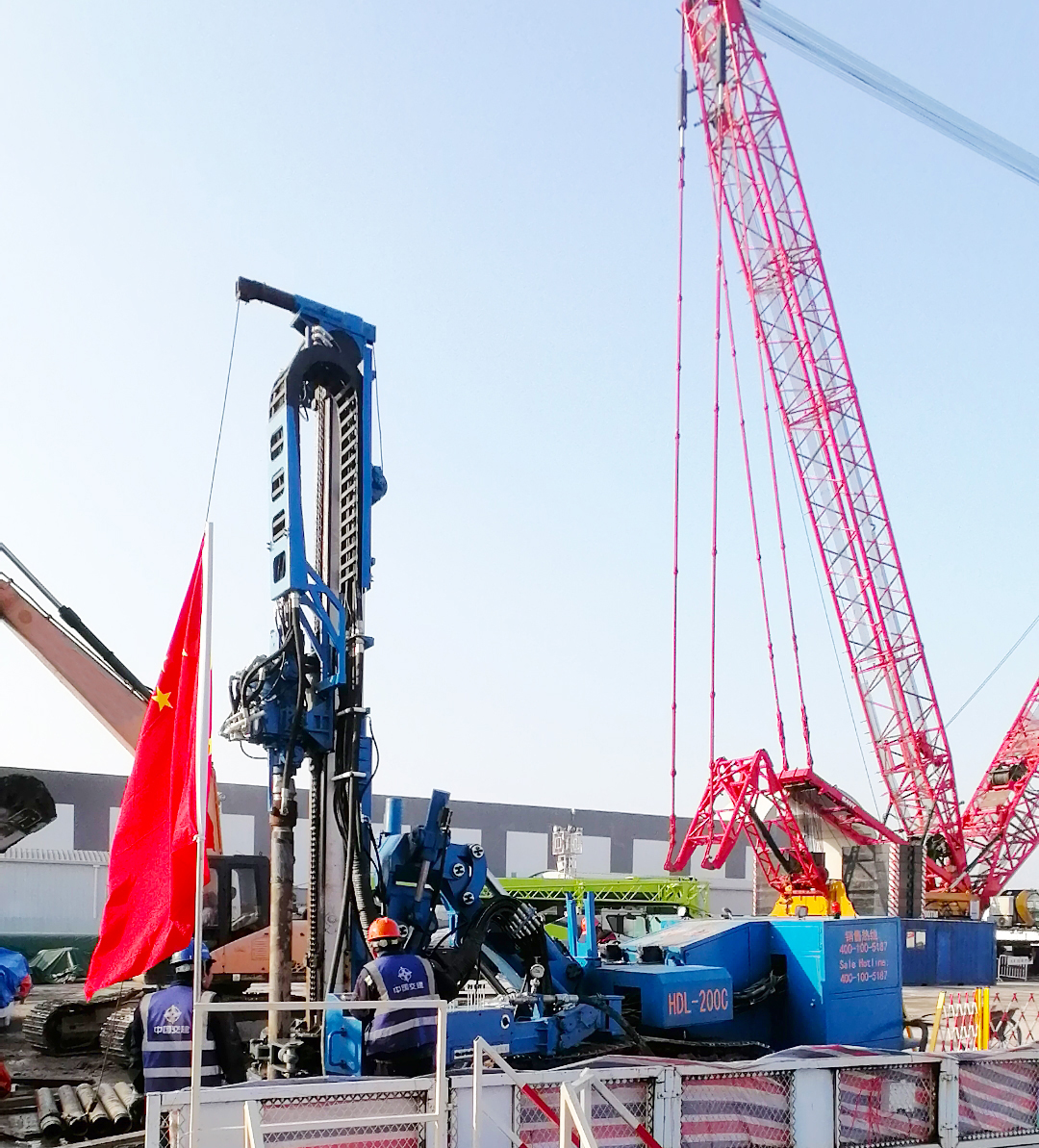 2、The drilling rig is in place, install the drill tool, measure the first drill tool left and adjust to the vertical state, the mast falls to the platform and force.