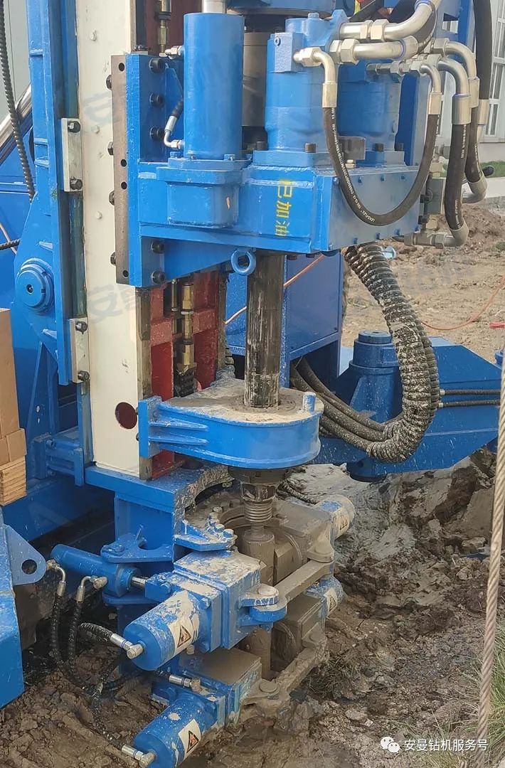 4、Give the power head into the stroke, release the chuck oil cylinder, lift the power head to the stroke, the chuck clamp the drill rod again, in turn to meet the depth requirements;