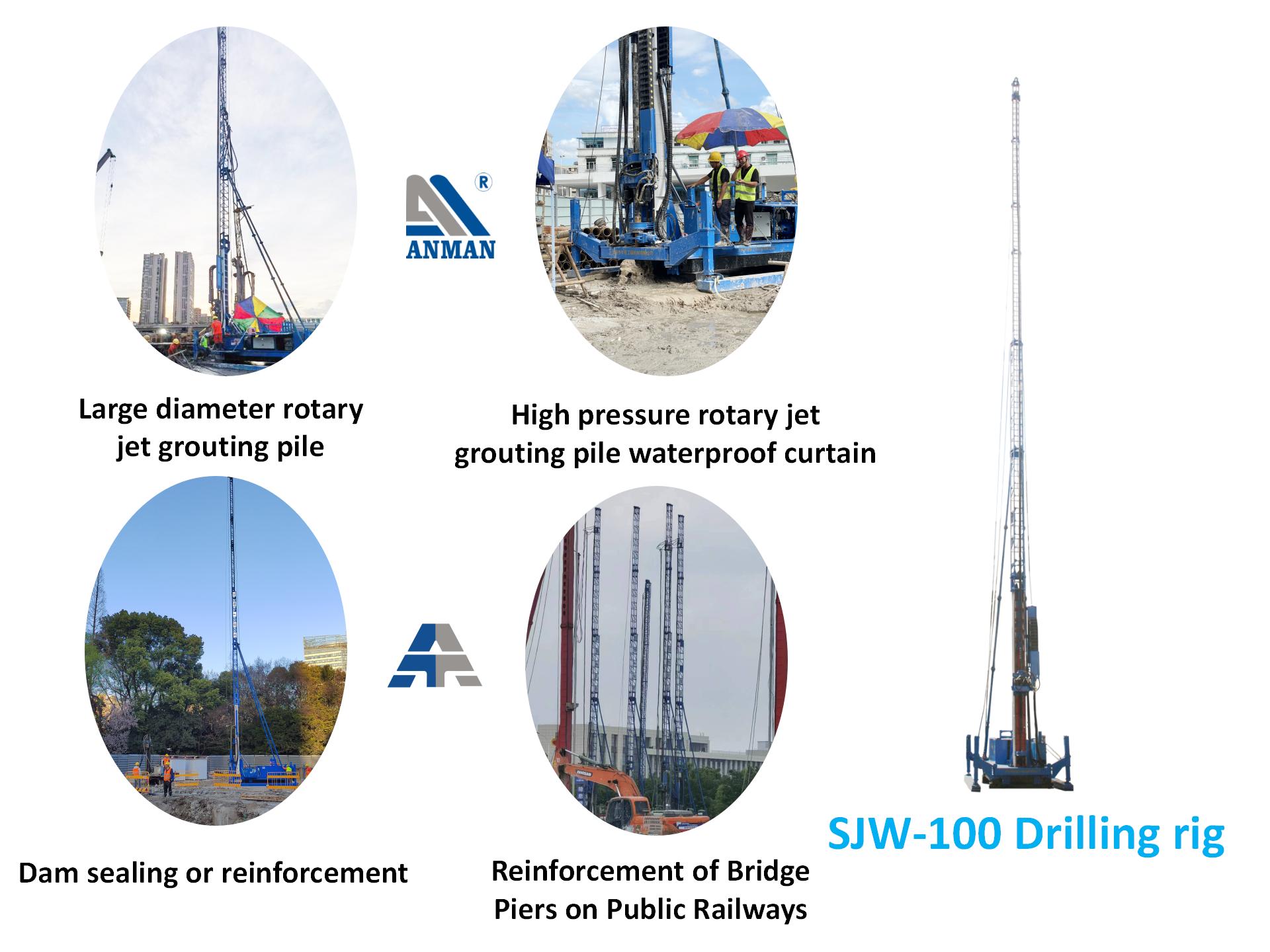 The 33.8 meter high intelligent system self drilling rotary jet drilling rig - SJW-100 high-pressure rotary jet drilling rig is a new type of high-pressure rotary jet drilling rig developed by Wuxi Anman based on market needs and through different module combinations, which can achieve construction processes such as fixed jet, swing jet, and rotary jet.